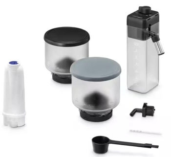 2 съёмных контейнера для зернового кофе, автоматический капучинатор, фильтр для воды, мерная ложка для молотого кофе, носик для подачи воды, щеточка для очистки, шнур питания, тест жёсткости воды